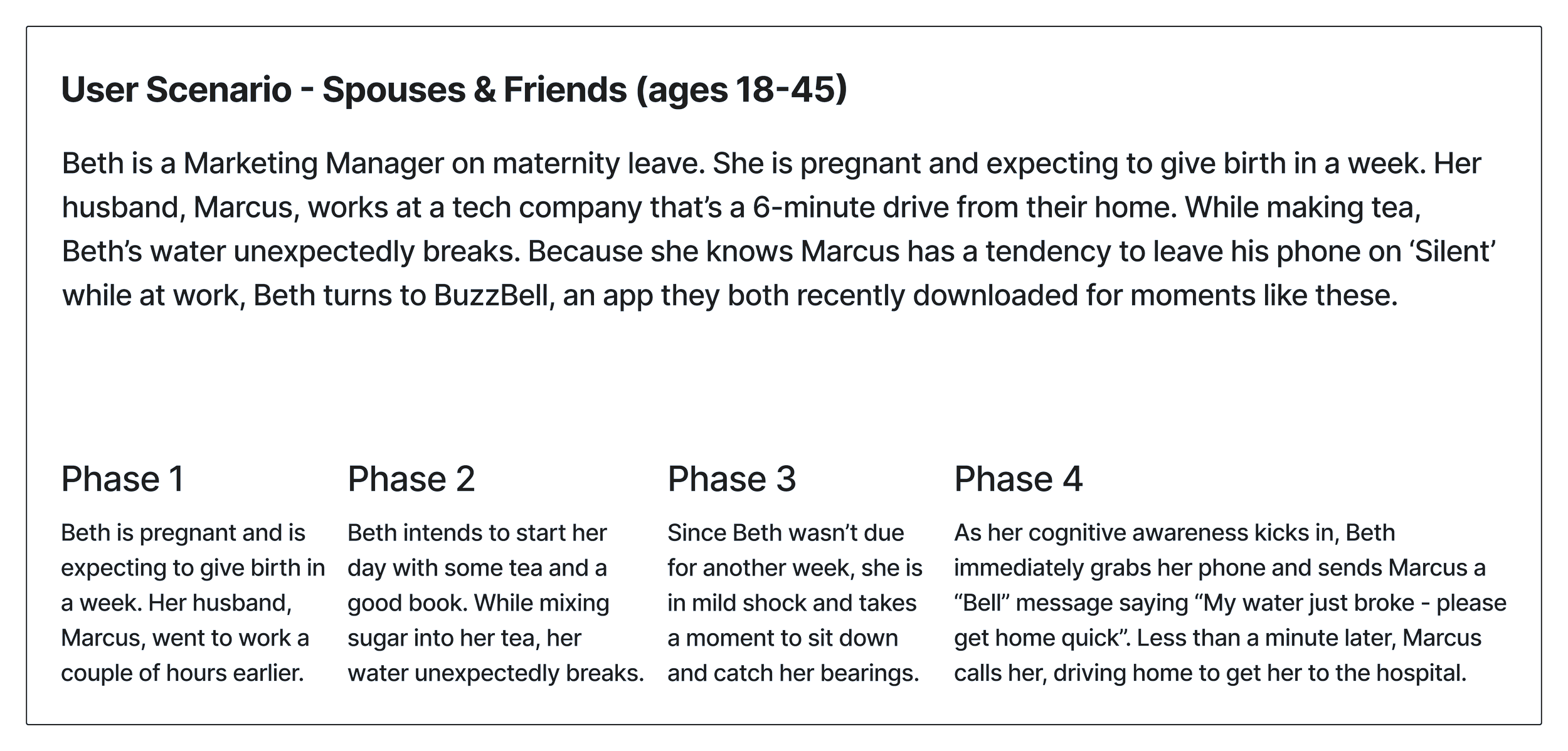 Based on 5 hypothetical target user groups, I developed 5 user scenarios (2 for ‘Buzz’, 3 for ‘Bell’), renewing our value proposition through the more nuanced and robust dualization of our patented offering.