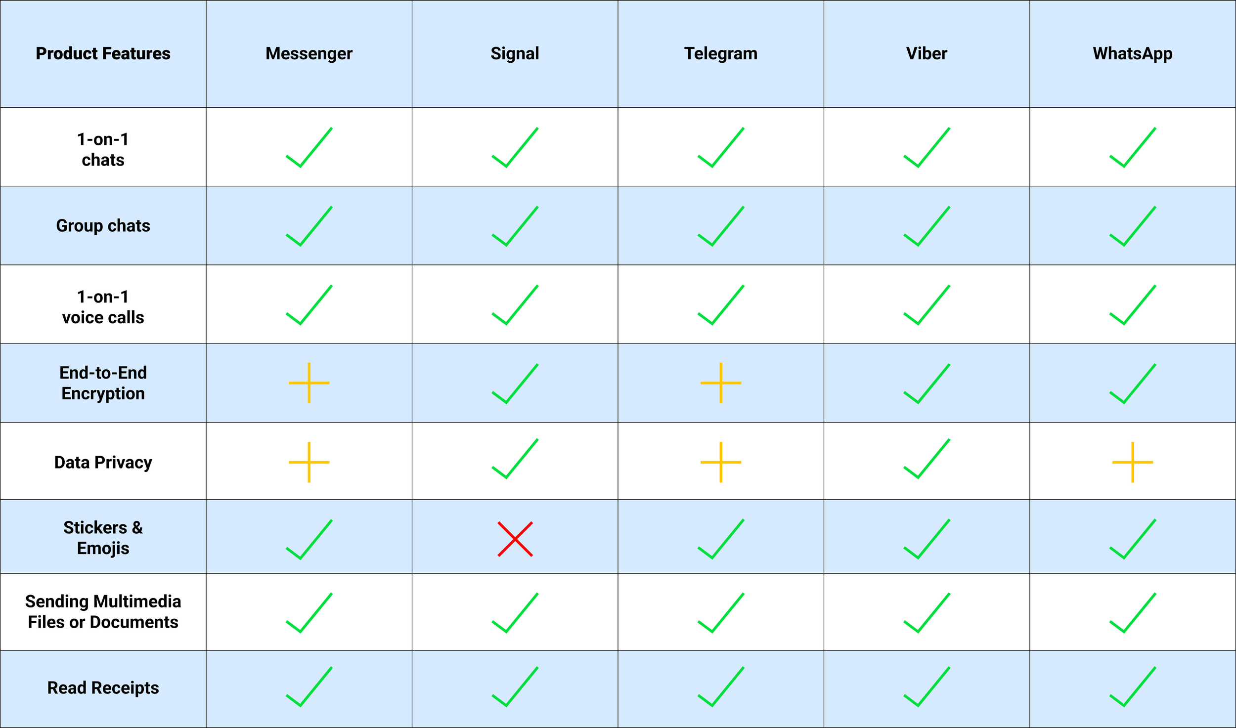 I conducted a competitive analysis of popular messaging apps - Messenger, Signal, Telegram, Viber, & WhatsApp - to identify gaps and opportunities.
