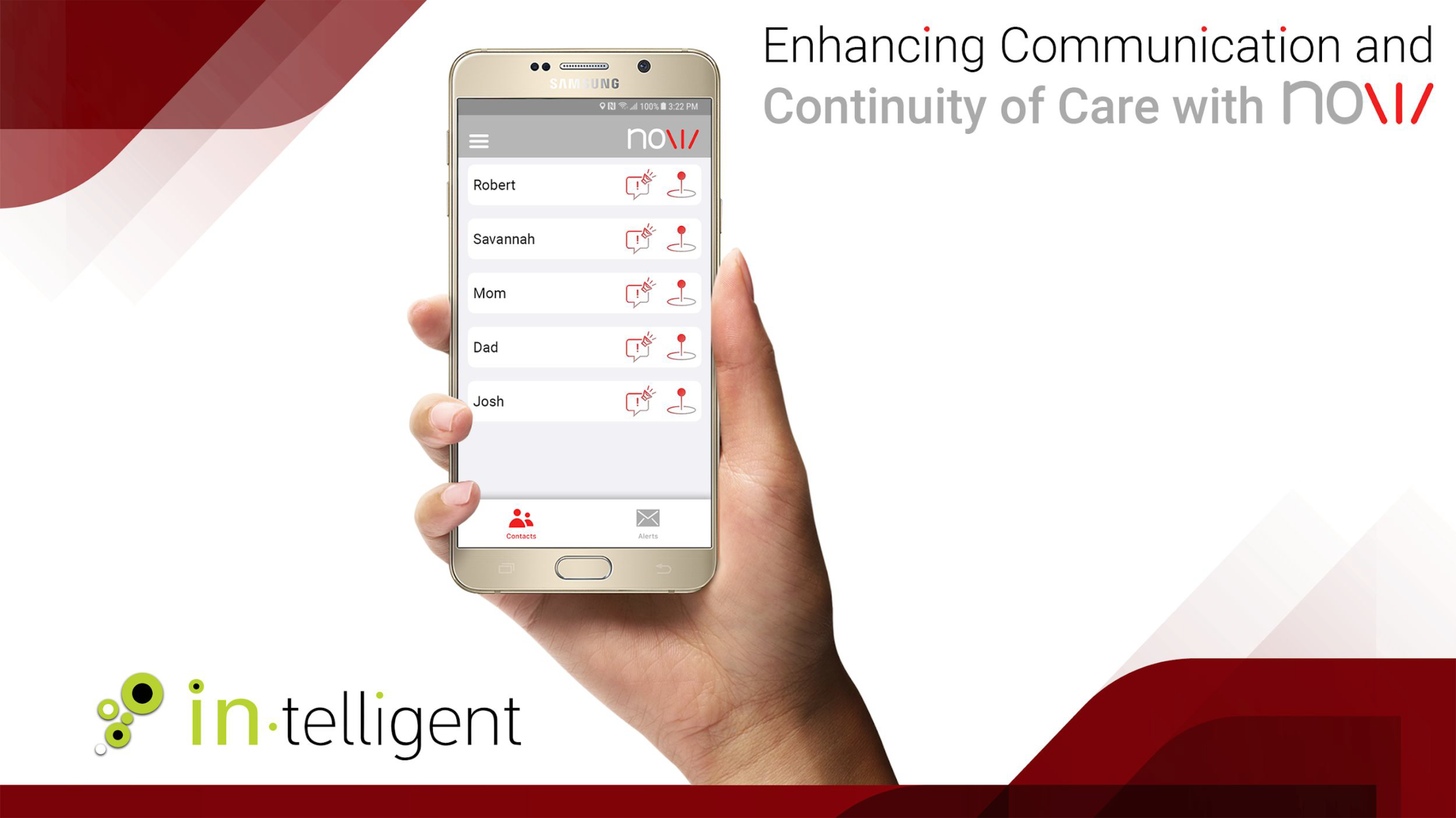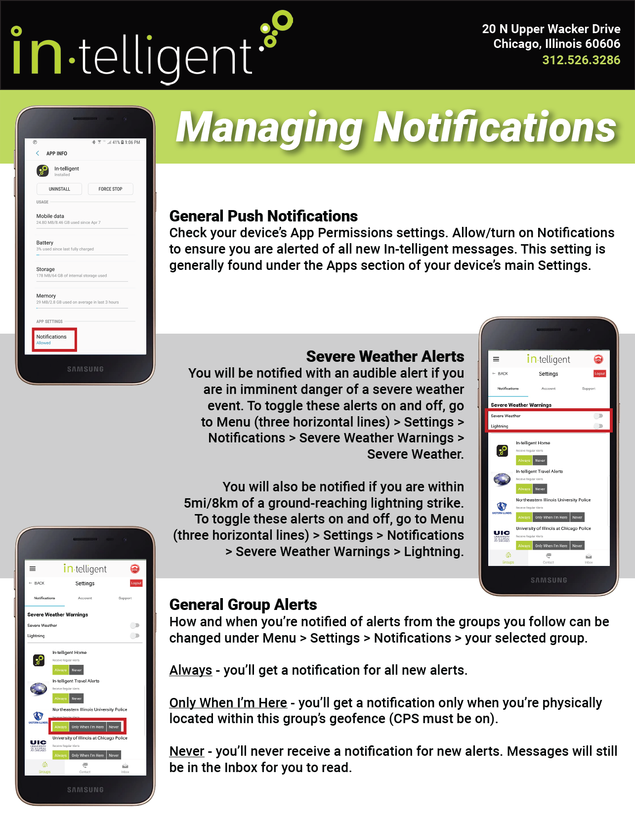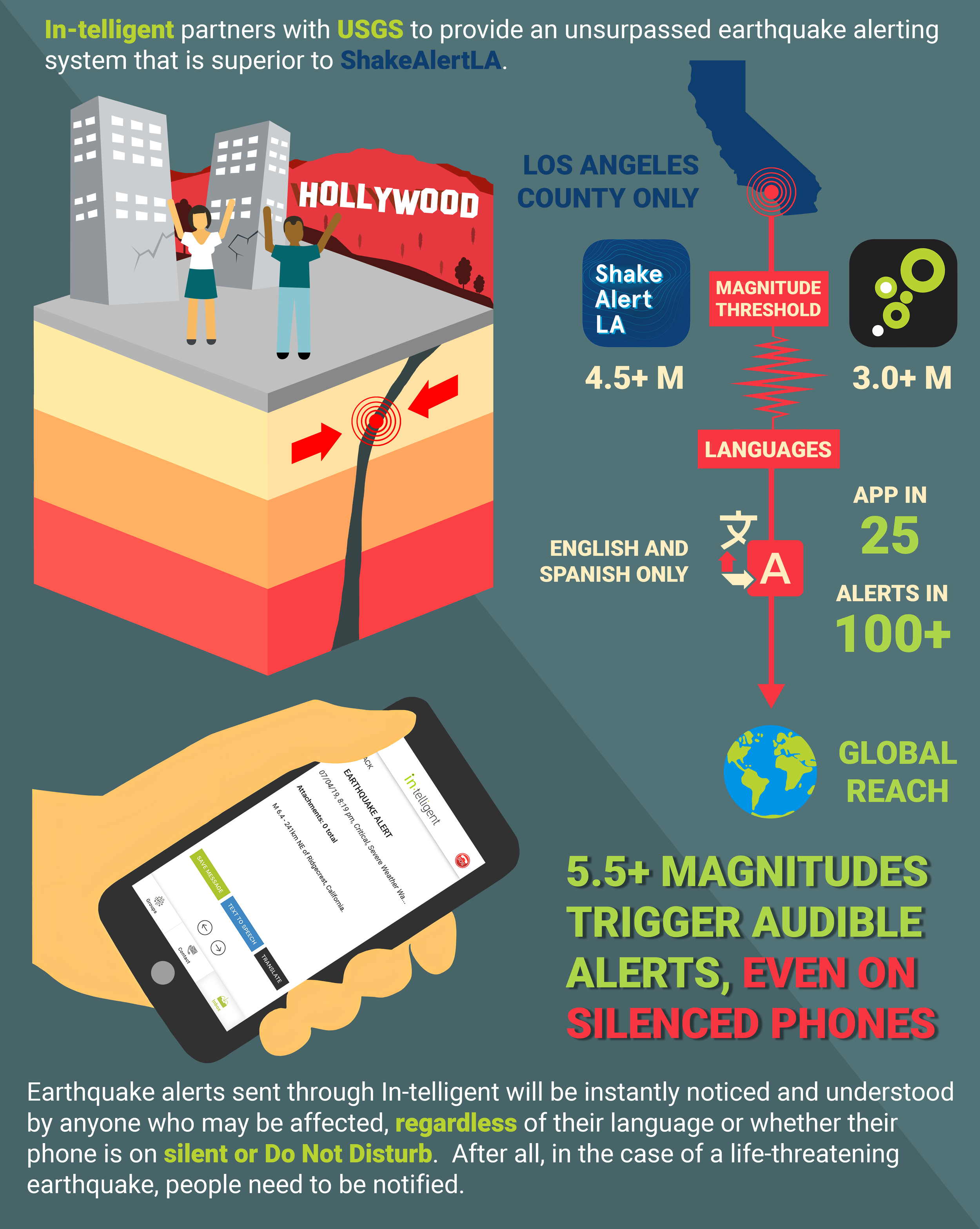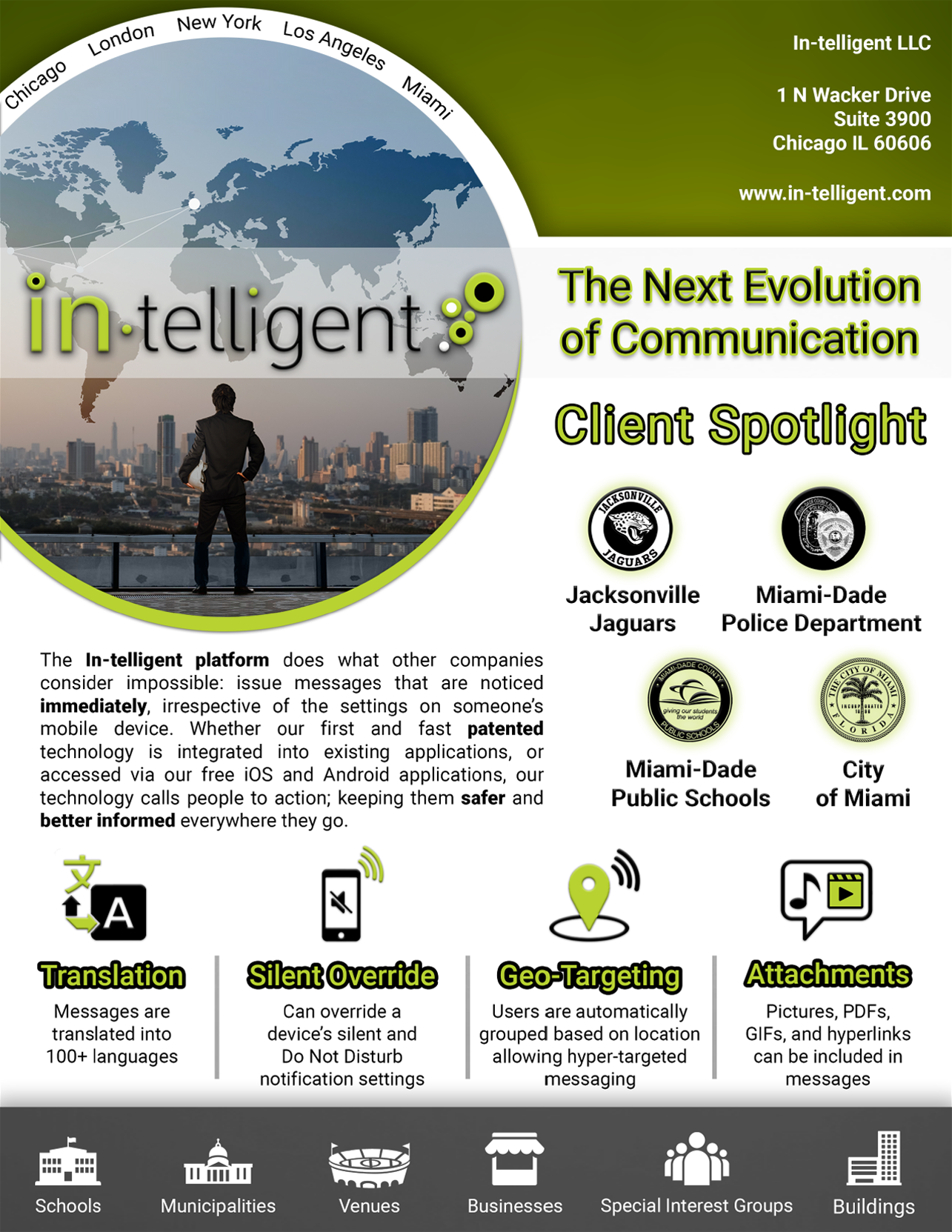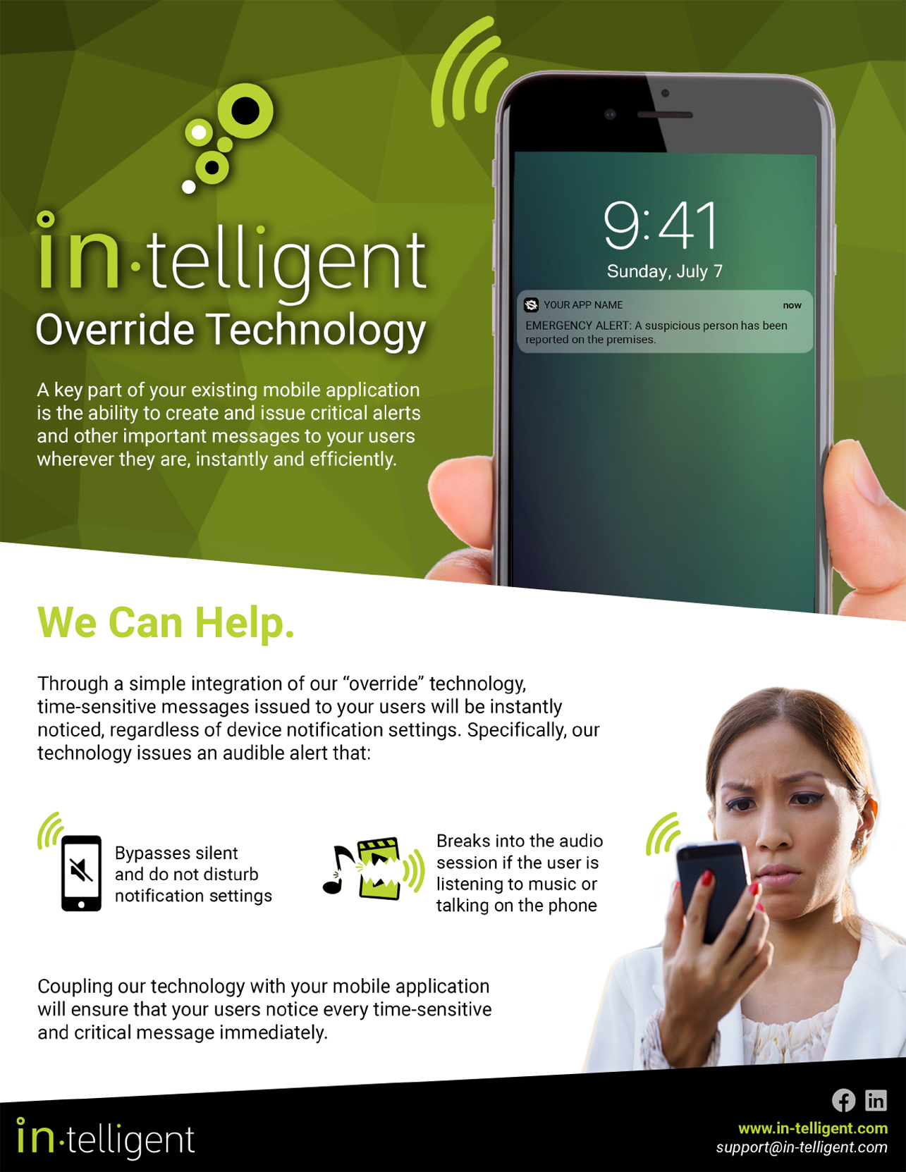 The In-telligent app enables clients to deliver urgent, critical alerts that bypass “Silent” & “Do Not Disturb” settings using patented technology. Clients include AMBER Alerts, USGS, schools, colleges, golf clubs, property managers, weather agencies, & municipalities. In September 2019, Meta was approached to integrate this technology into Facebook, Messenger, & WhatsApp.